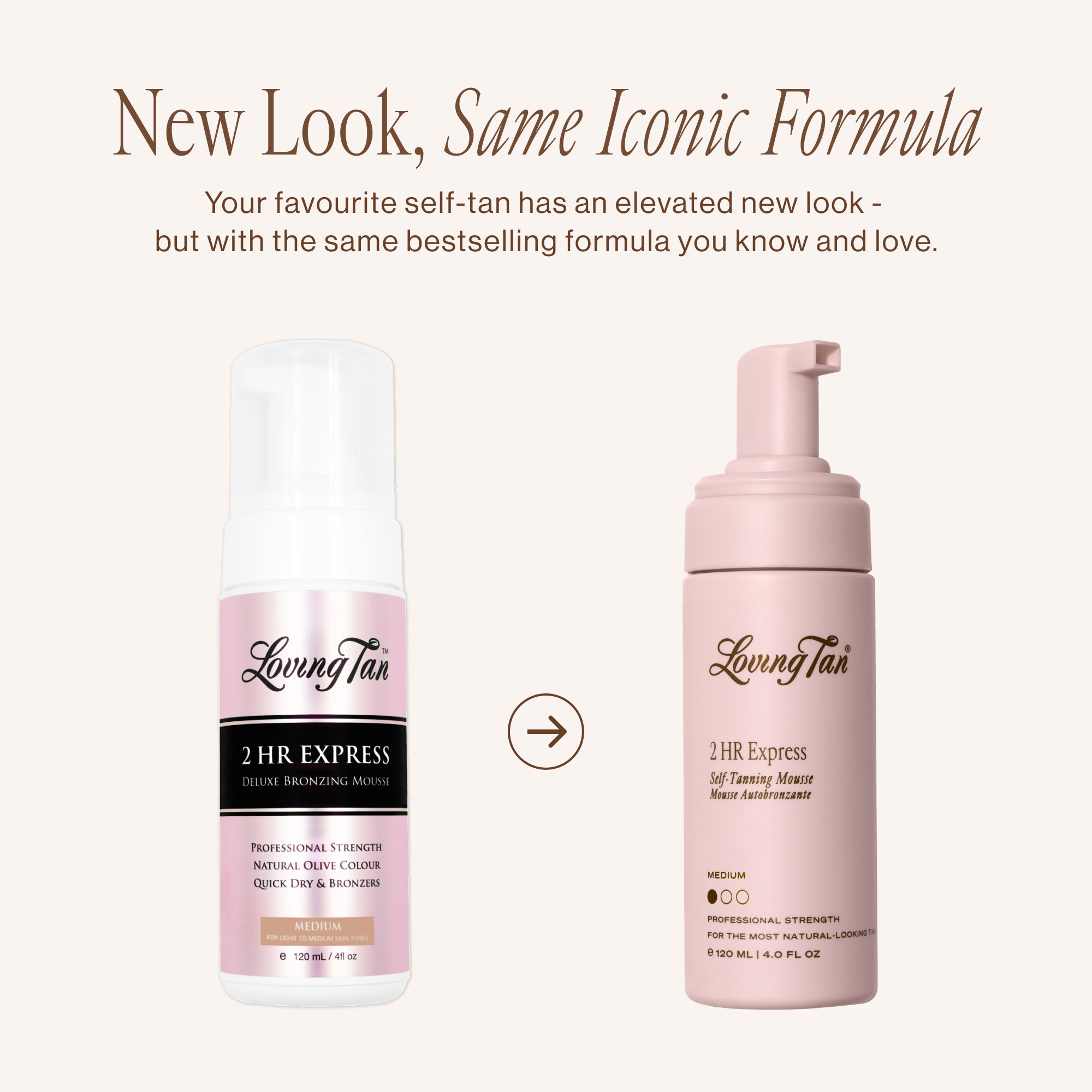 The only difference between the 2 HR Express Self-Tanning Mousse and the 8 HR Deluxe Self-Tanning Mousse is the rinse-off time. The 8 HR Deluxe Self-Tanning Mousse needs to be rinsed off after six to eight hours, while the 2 HR Express Self-Tanning Mousse can be rinsed off in just two hours.