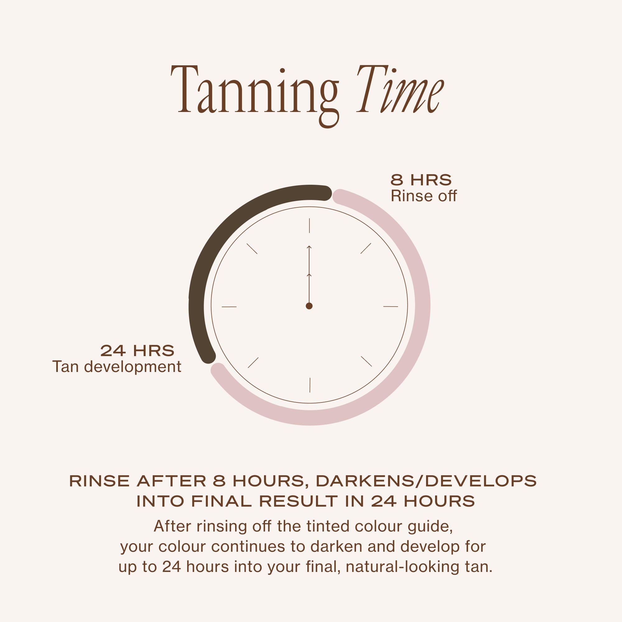 - Rinse colour guide off after 8 hours. Your tan will continue to develop for up to 24 hours.