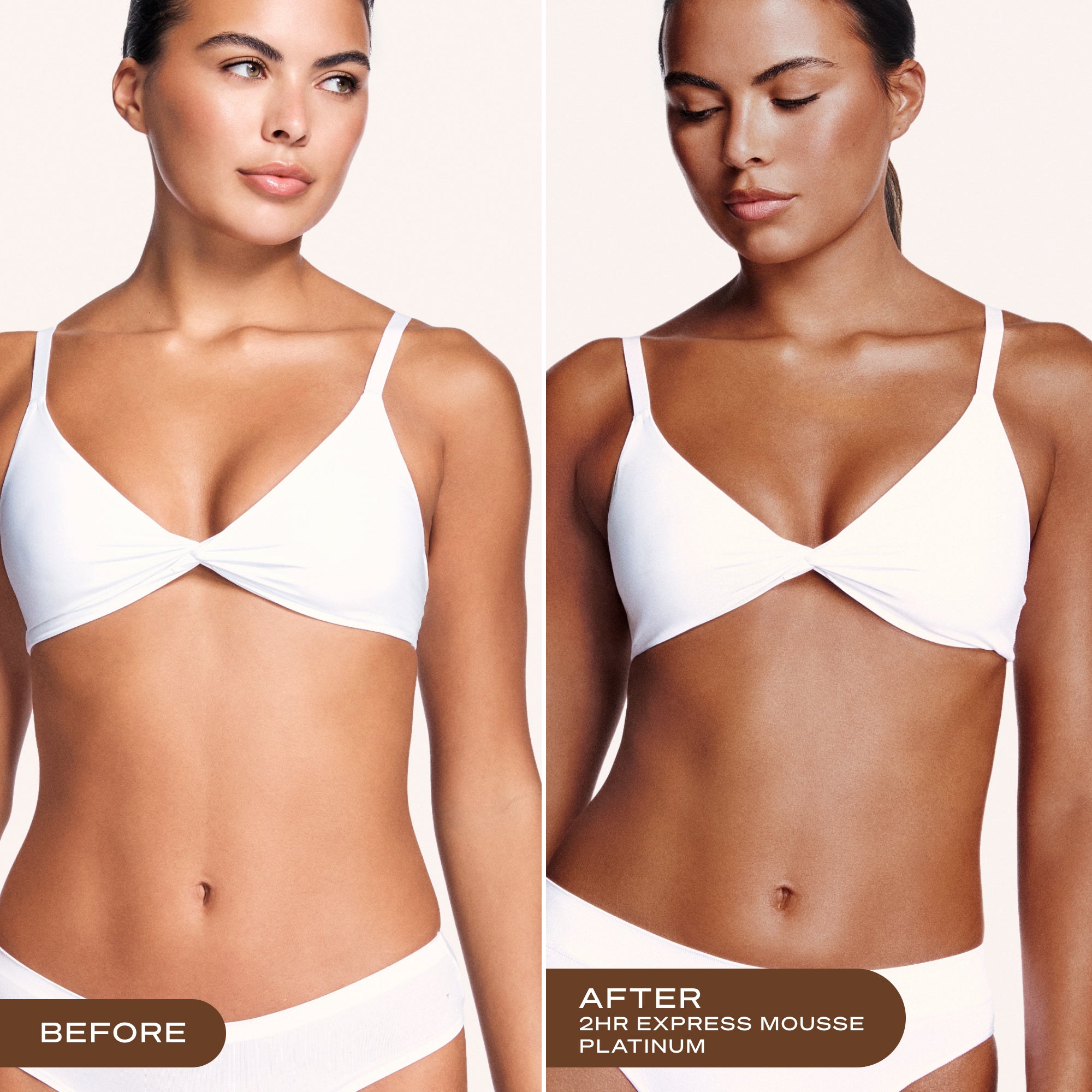 2 HR Express Platinum Self-Tanning Mousse is our deepest, darkest shade for a natural-looking tan with a streak-free finish; the colour guide can be rinsed off in 2 hours.