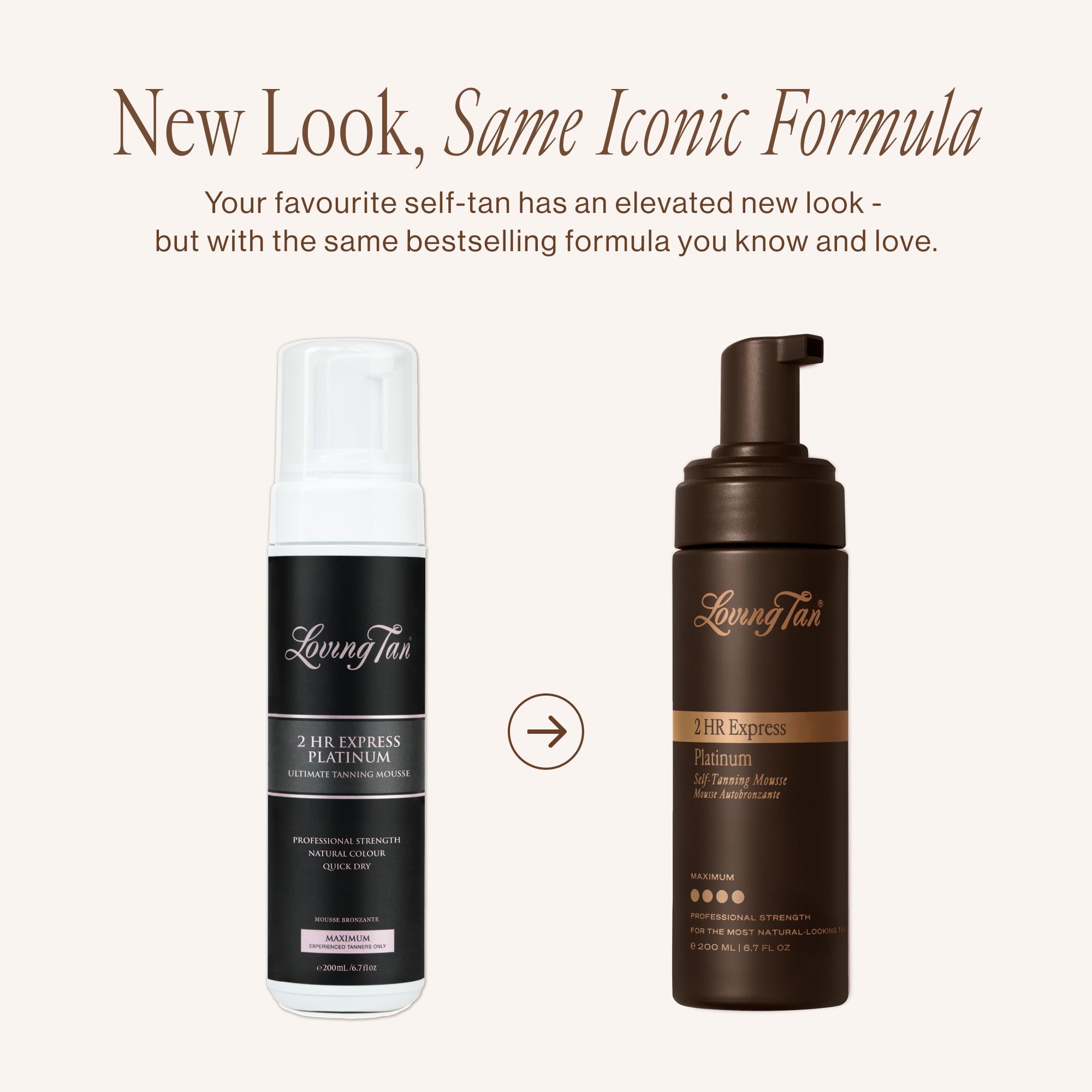 The only difference between the 2 HR Express Platinum Self-Tanning Mousse and 8 HR Deluxe Platinum Self-Tanning Mousse are the rinse-off times. The 8 HR Deluxe colour guide needs to be rinsed off after eight hours, while the 2 HR Express colour guide can be rinsed off in just two hours. Both products will continue to darken and develop for up to 24 hours after rinsing off the tinted colour guide.