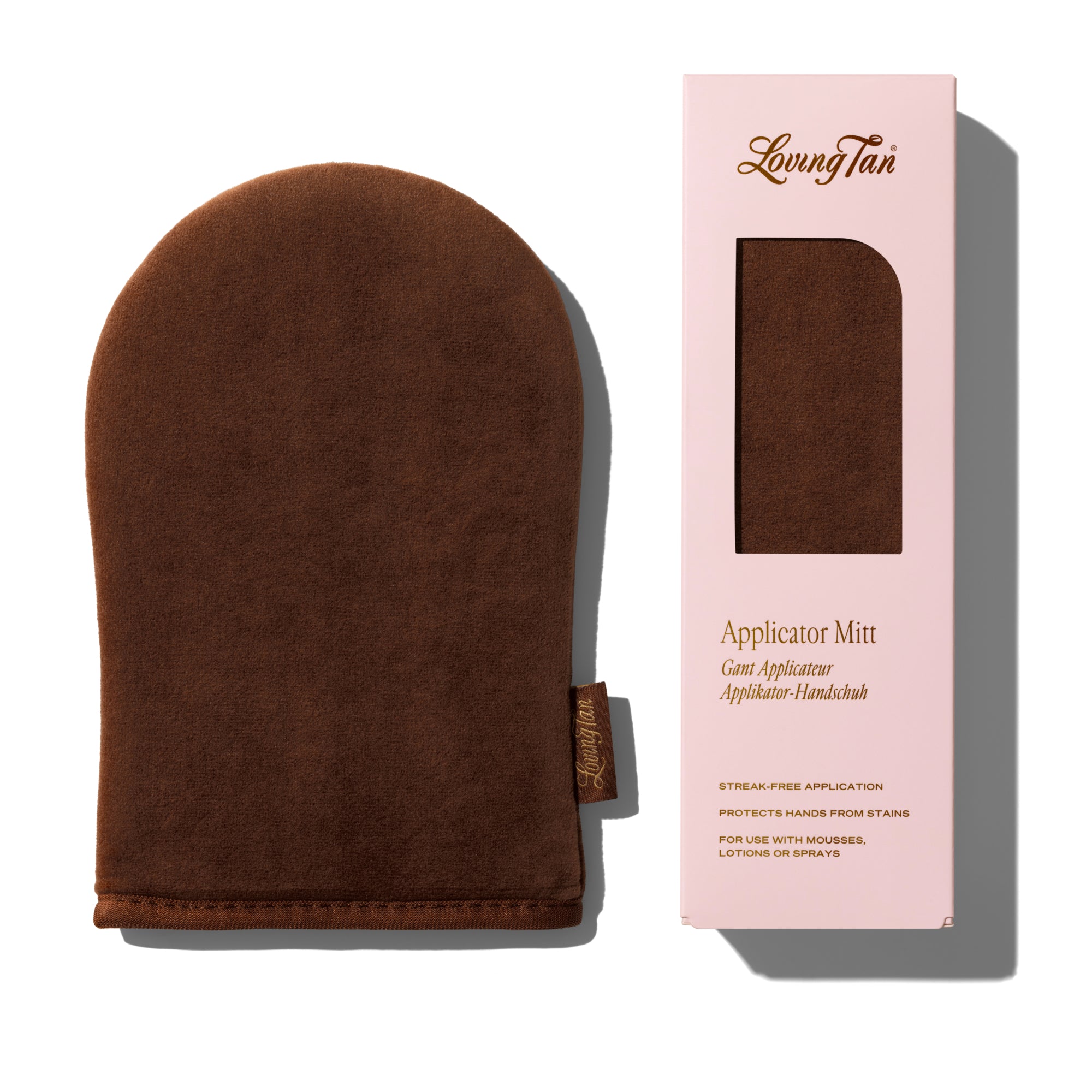 Loving Tan Self-Tanning Applicator Mitt is an ultra-soft velour tanning mitt for streak-free, even self-tan application that blends flawlessly while protecting hands from stains.